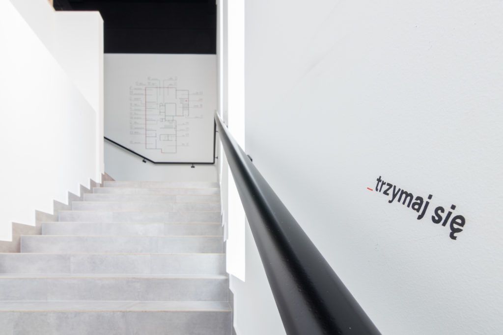 The wayfinding in the office’s interior is based on the typography that forms the basis of our brand. Font Acumin Pro in many varieties is the main graphic element appearing in space. The rooms in the office have names with selected fonts and correspond with the specificity or association of the specific room, eg the kitchen is Frutiger, the conference rooms are Futura and Baskerville, and the space for rest is Comic Sans. Throughout the office, there are powerful, hand-painted (with care and respect for optical nuances) letters that make up the inscription “Admind”. The lettering fits into the space, and in addition to the decorative and complementary function. They also have the form of boards, on which you can hang mood boards and other materials – we have painted the letters with magnetic paint.